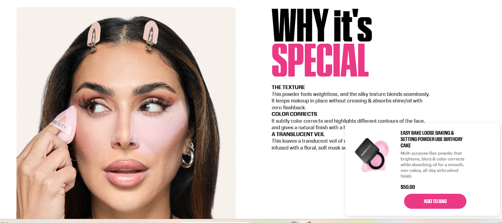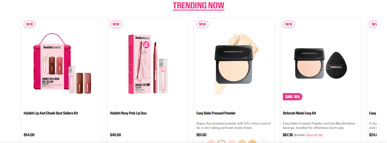 Makeup is one of the most trend-sensitive consumer categories, and Huda Beauty treats it as such. The “Trending Now” section is surfaced prominently and feels alive rather than static. This allows the brand to constantly signal relevance, keeping the website aligned with what is currently popular across social media, creators, and pop culture. Instead of forcing users to search for what’s new, the site brings trends directly to them, reinforcing Huda Beauty’s authority as a brand that leads rather than follows.