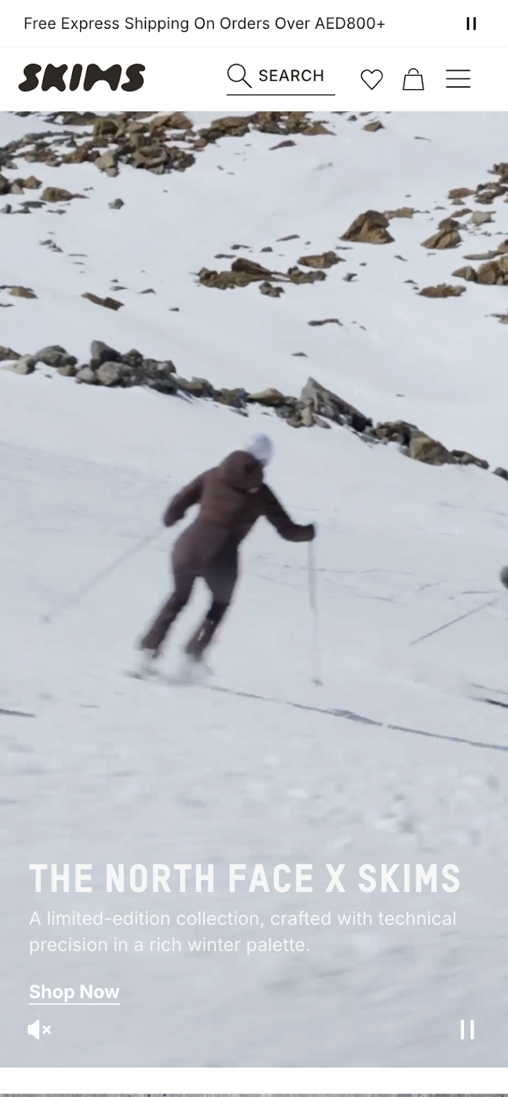 One of the strongest aspects of Skims’ homepage is how confidently it leads with its collaborations. Partnerships like Nike x Skims and The North Face x Skims are not hidden away as press mentions; they are front and centre. This immediately reframes Skims in the mind of a new user. If globally trusted brands like Nike or The North Face are willing to collaborate, it sends a clear signal that Skims is operating at a high quality and credibility threshold.
