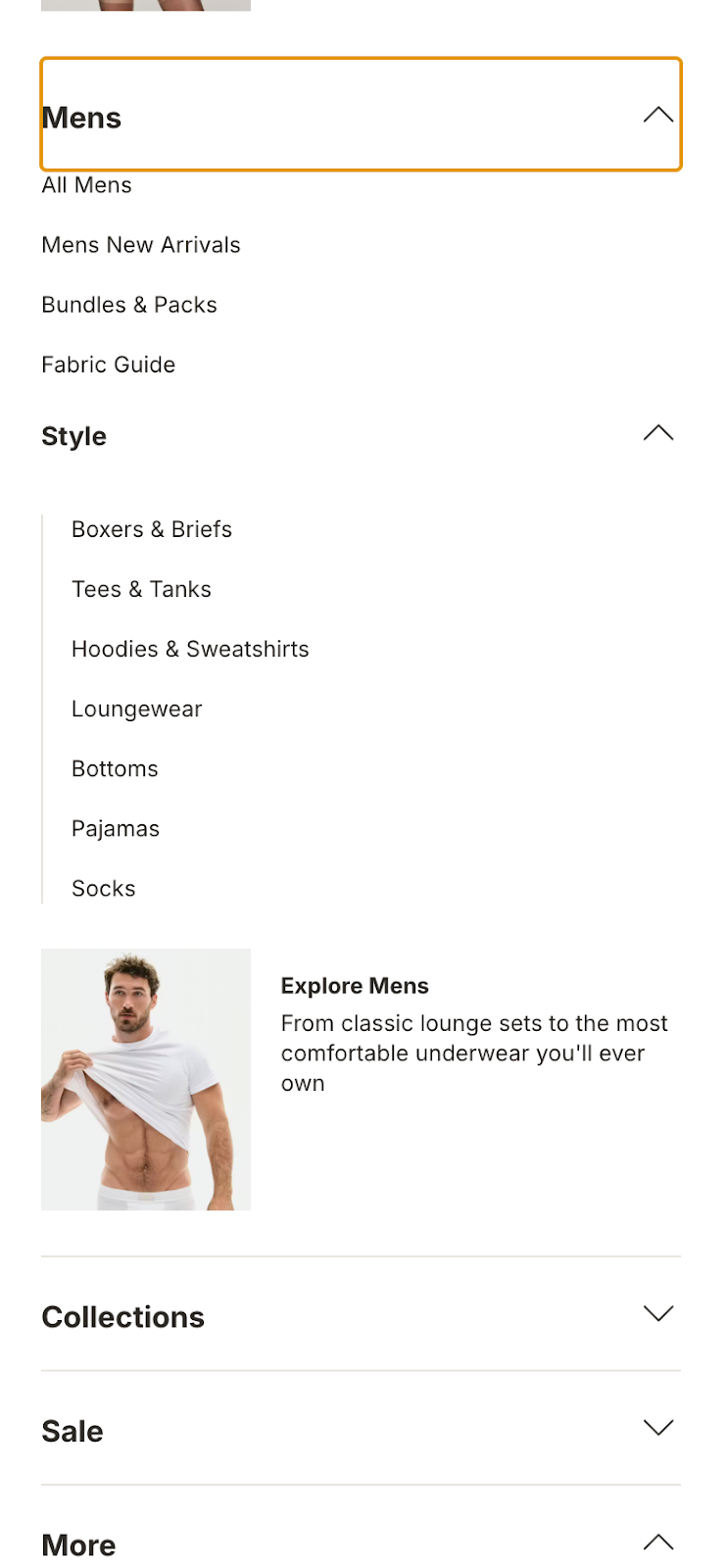 For example, within shapewear, users can navigate by product type, solution, or compression strength, all from a single flow. Men’s and women’s sections are equally detailed, with new arrivals, bundles, fabric guides, and styles clearly mapped out. Visual cues within the menu further support decision-making, reducing the need for trial-and-error browsing.
