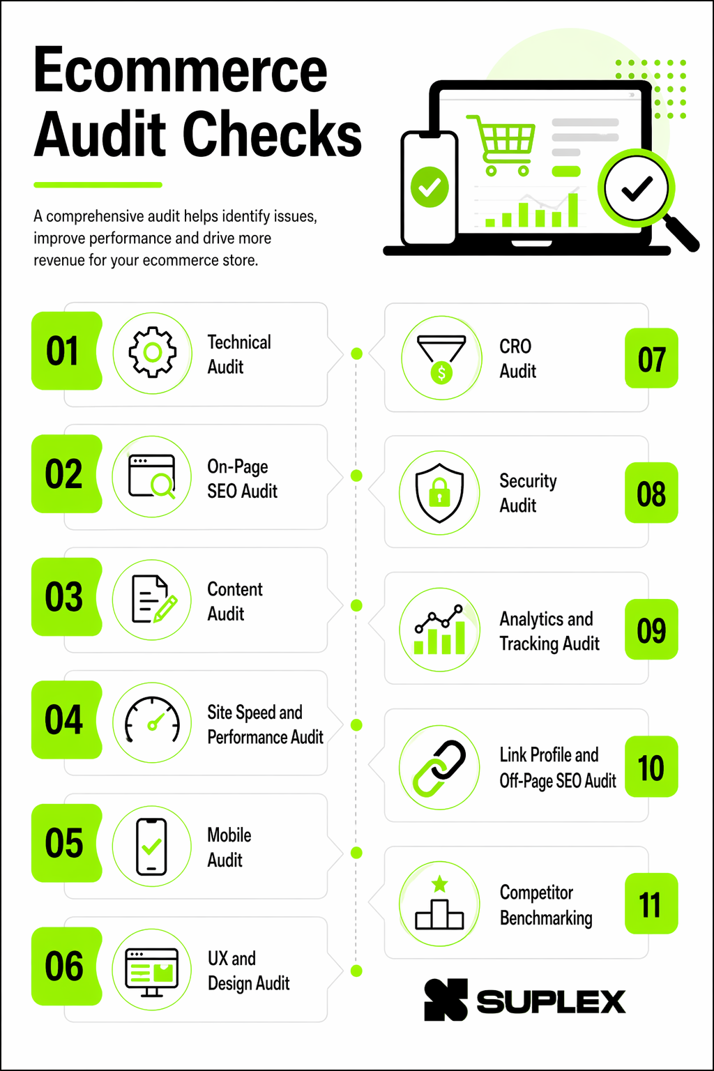 Speed is just one factor. An audit by Suplex Design covers 11 distinct areas: technical SEO, on-page SEO, content, site speed, mobile, UX, conversion rate optimisation (CRO), security, analytics, link profile and competitor benchmarking.