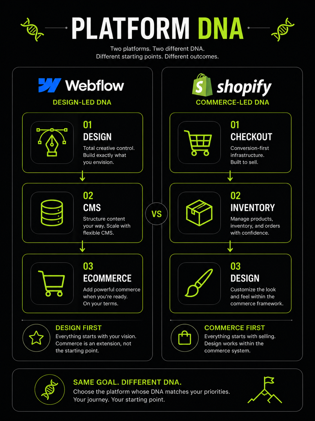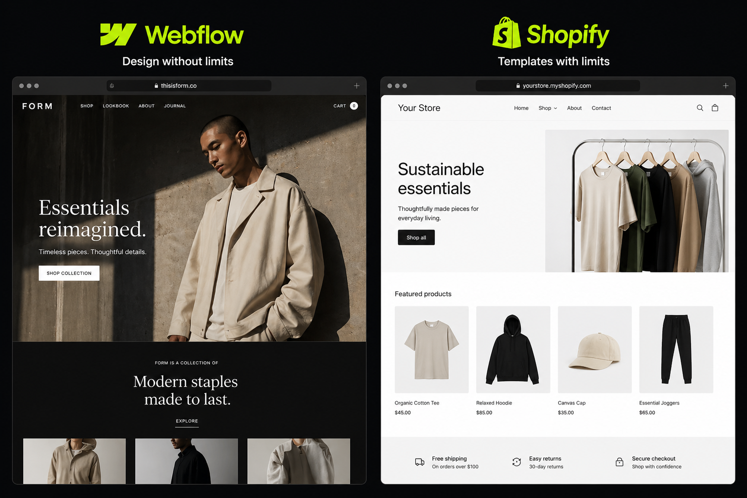 Webflow is a design-first visual website builder that adds ecommerce capability. Shopify is an ecommerce-first platform that adds design tools.