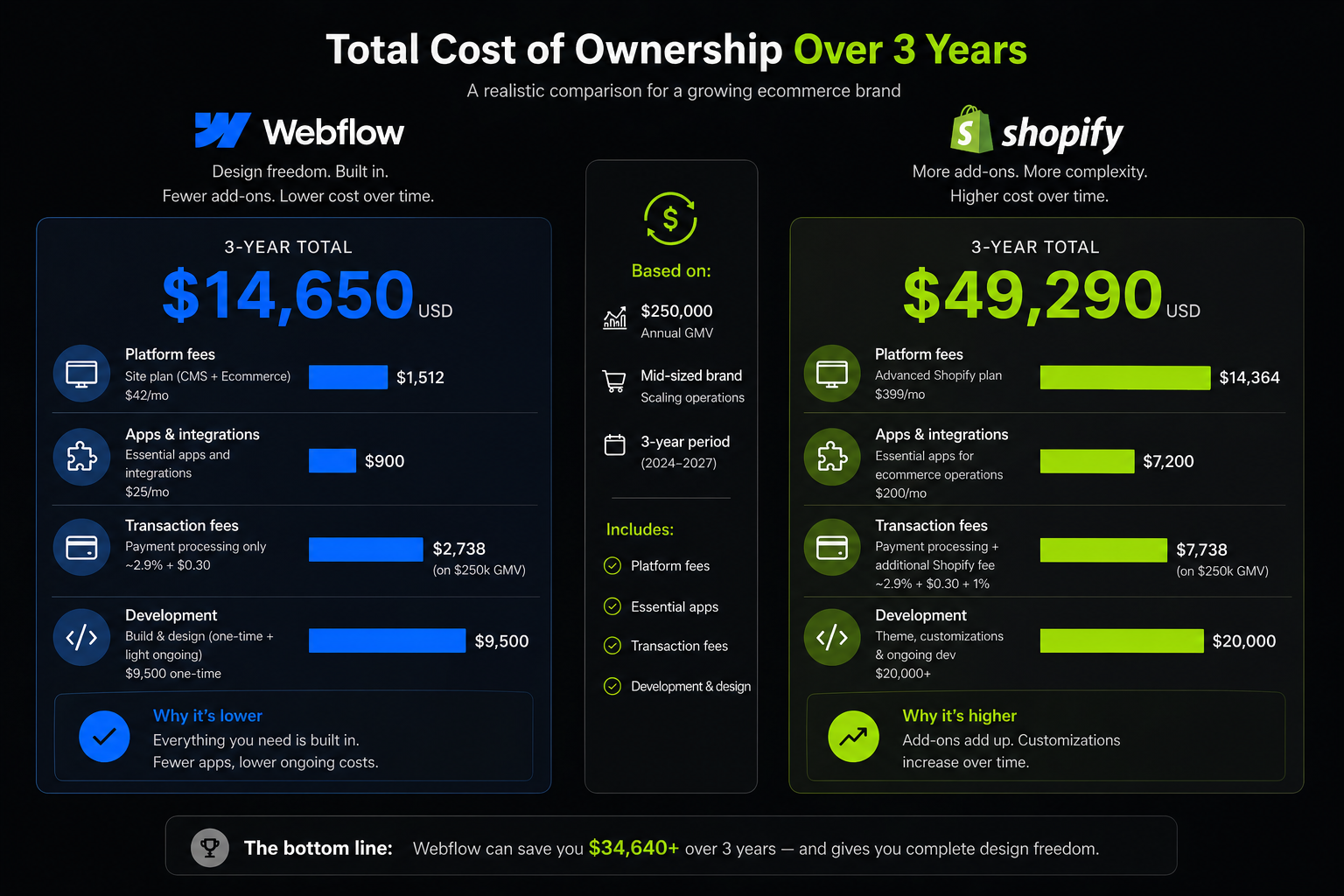 For simpler stores, Webflow can be more cost-efficient. For complex operations requiring Shopify's full app ecosystem, the costs are comparable but the commercial capability Shopify provides at that cost level is greater.