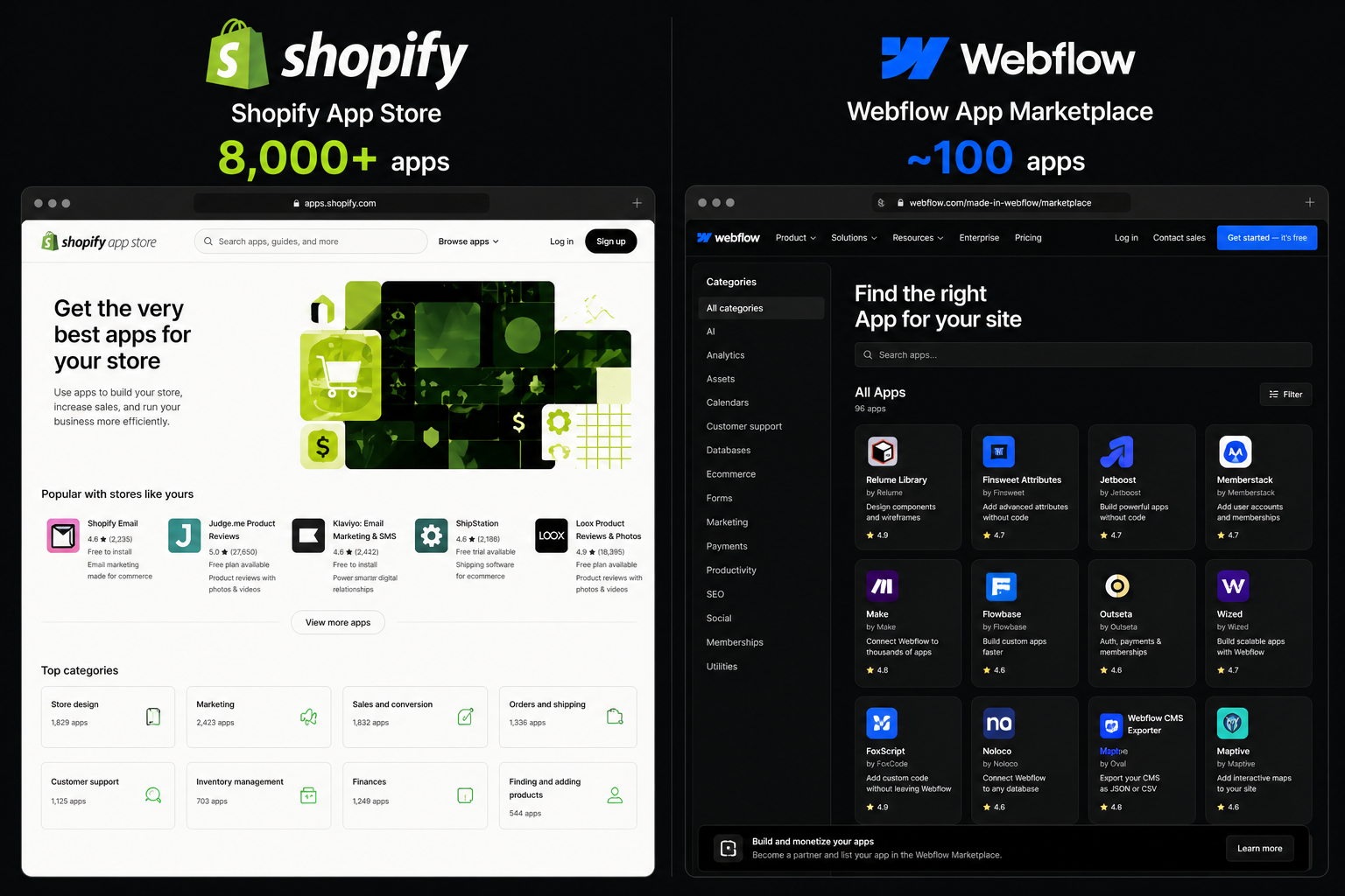 For simpler stores with smaller catalogues and limited app requirements, Webflow can be more cost-efficient particularly at the Business plan where transaction fees drop to zero. For stores that need Shopify's full app ecosystem to operate, the cost comparison tilts toward Shopify being more expensive in absolute terms, but justified by the commercial capability it provides.