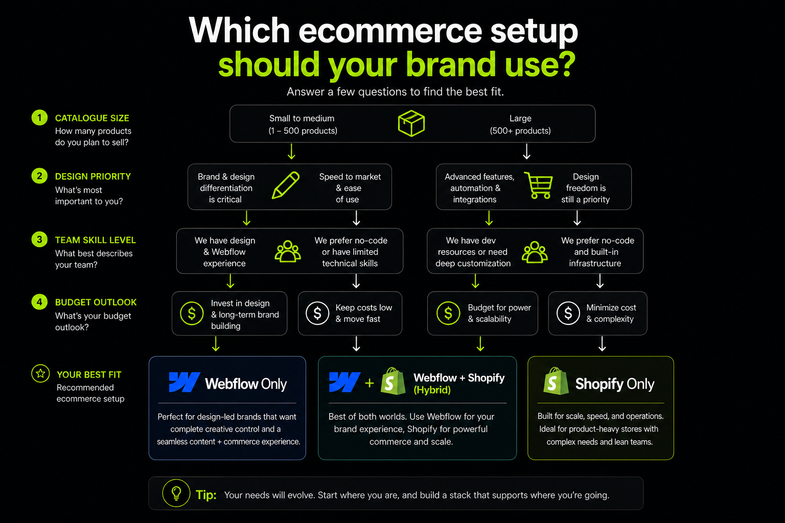 It also covers the hybrid option using Webflow and Shopify together and gives you a clear decision framework by brand type.
