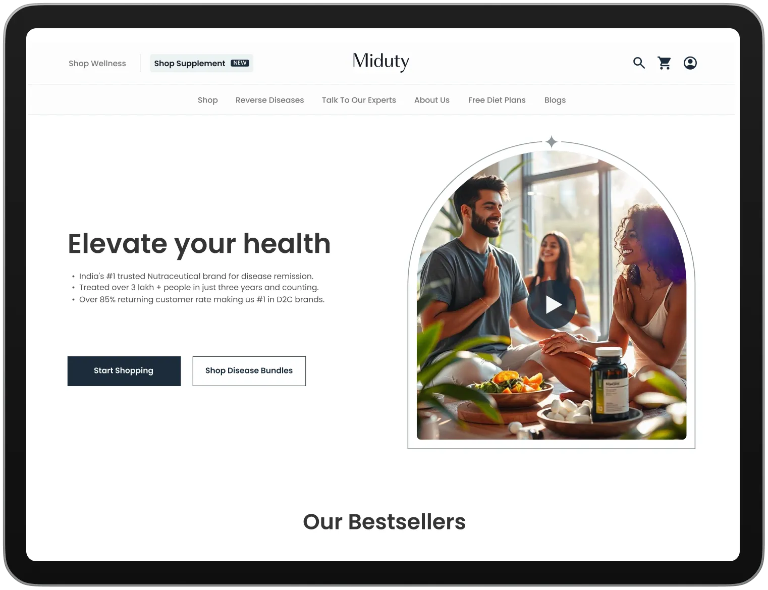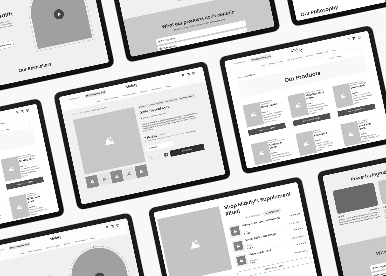 Detailed wireframes were created to map out the website’s layout, interactions, and content hierarchy before moving into visual design. These wireframes acted as a functional blueprint, ensuring every element served a clear purpose within the user journey. This stage played a critical role in aligning usability, navigation, and interaction design with Miduty’s broader vision of simplifying self-care through a well-considered digital experience.