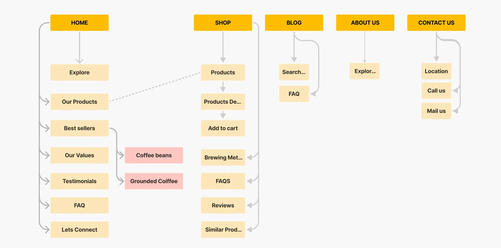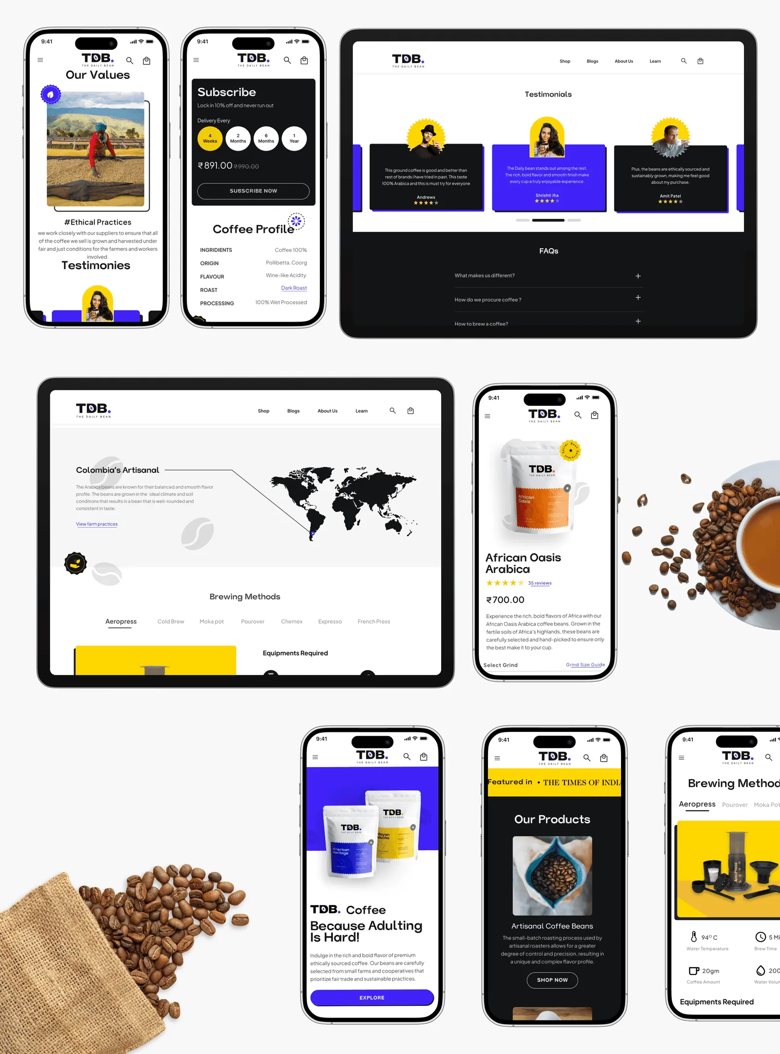 Detailed wireframes were developed to define the structure, layout, and interaction patterns of key pages. This stage established a strong functional foundation, ensuring a consistent user flow while aligning the experience with The Daily Bean’s premium brand direction.